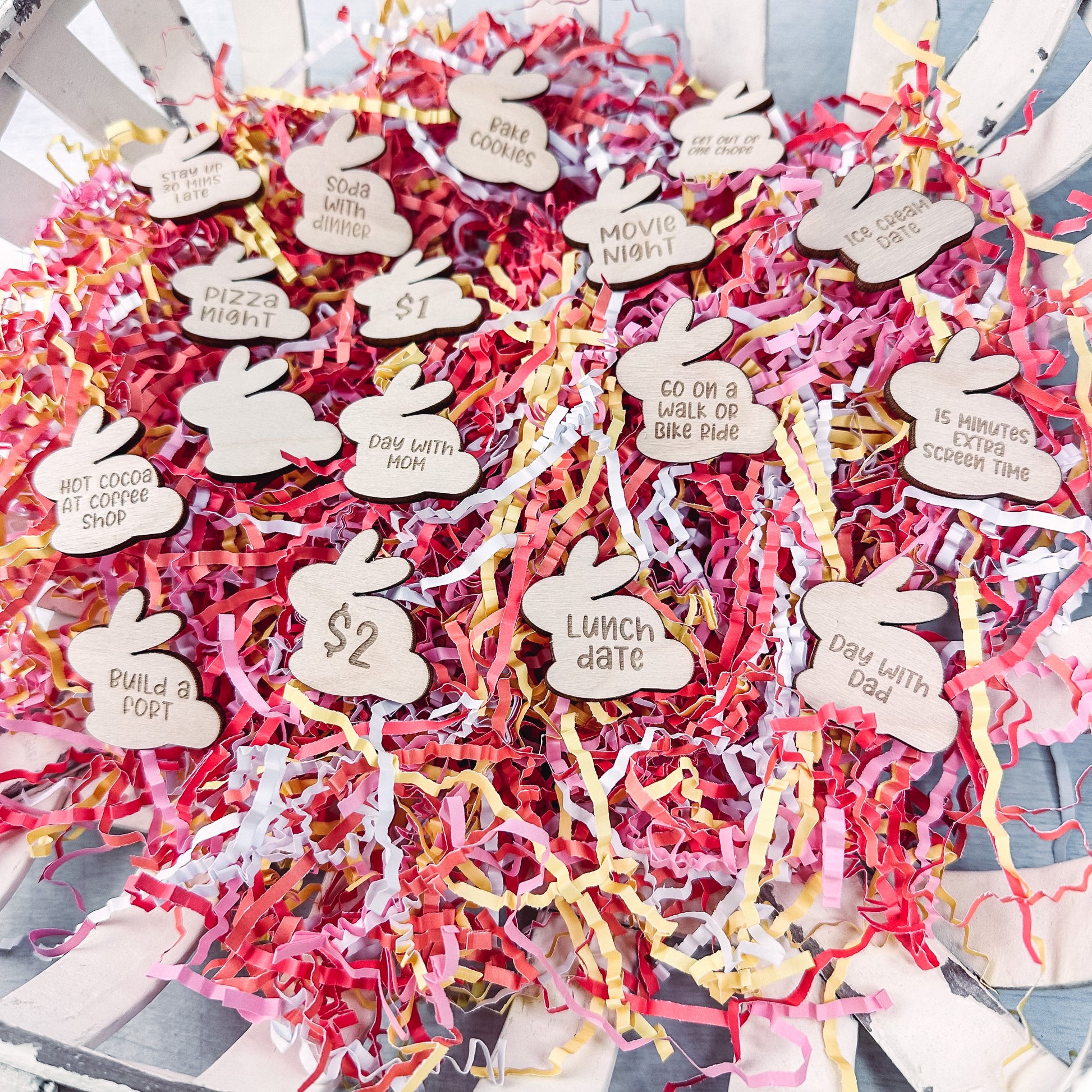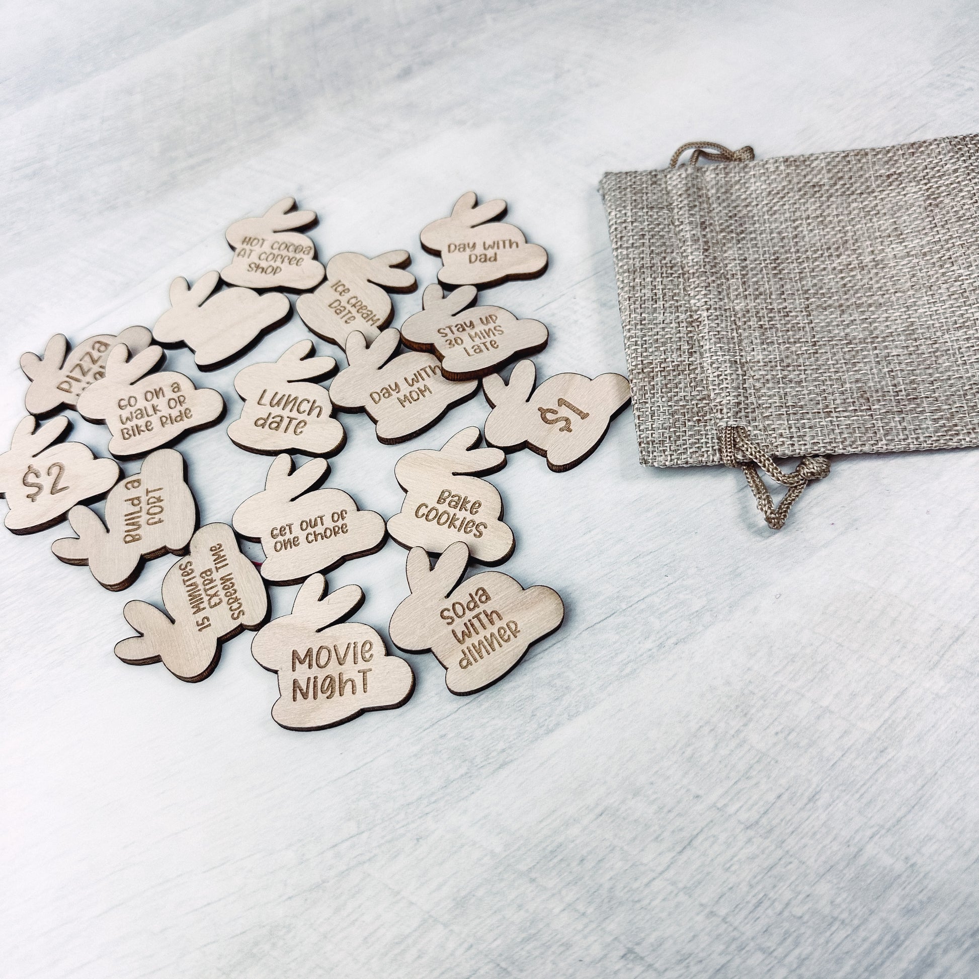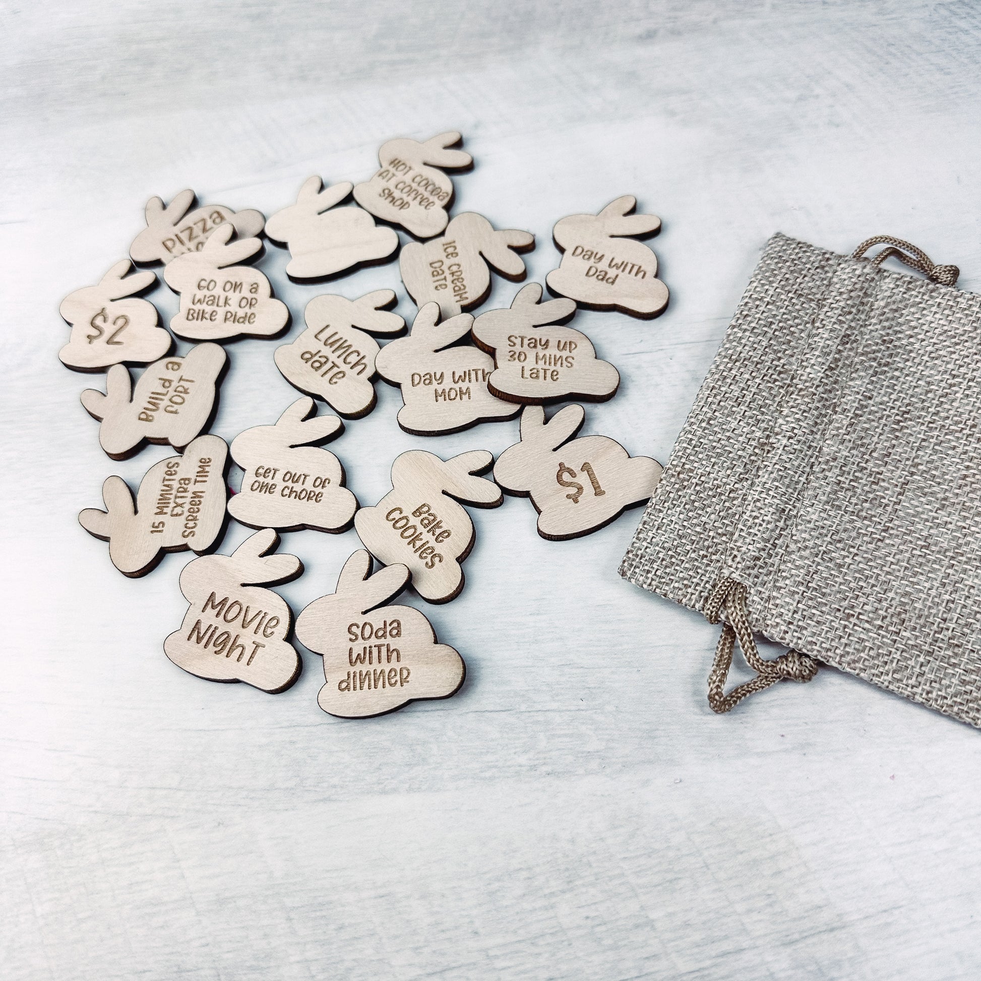 Trying to stay away from so much candy this Easter? These Easter Egg tokens are the perfect stuffers for plastic eggs for the kids to find on Easter morning. There are 16 different pre engraved bunnies and an extra blank one to put what you would like on it!